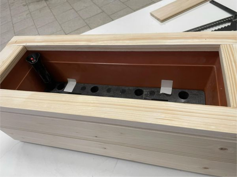 Dřevěný květinč se samozavlaovacm kolíkem. Rozměry (d*š*v) 65*20*20 cm. Objem koflíku je 11 litrů.